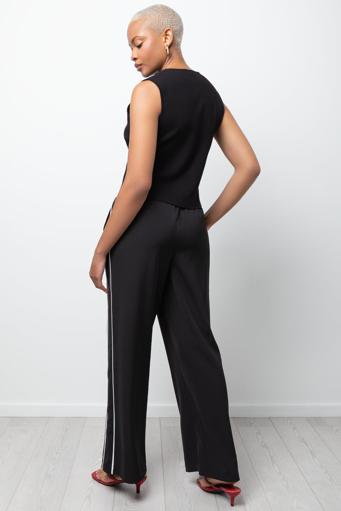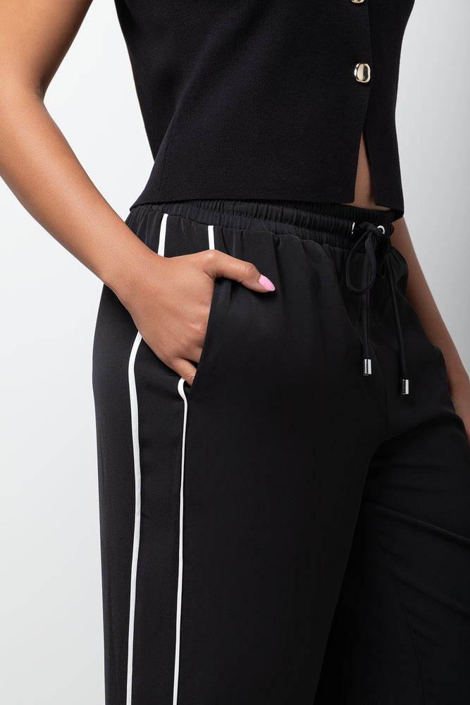 Refined pull-on trousers in black with contrasting side piping. Smart enough for the office, comfortable enough for everyday.
